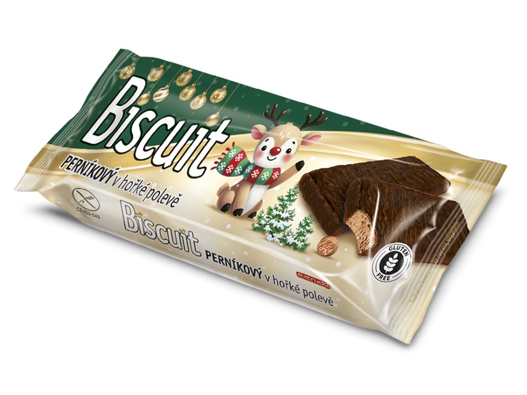 Složení: hořká poleva 67% (cukr, plně ztužený rostlinný tuk RSPO-MB (palmojádrový), kakaový prášek se sníženým obsahem tuku (16%), emulgátory (sójový lecitin, polyglycerol-polyricin-oleát), aroma), extrudovaný křupavý chléb 33% (rýžová mouka, kukuřičná drť, hrachová mouka (žlutý hrách), karob, třtinový cukr, perníkové koření 1%, sůl).